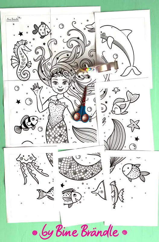 - Das Motiv "Die große Meerjungfrau" wird ganz einfach auf neun A4 Blättern ausgedruckt und passgenau aneinander geklebt.