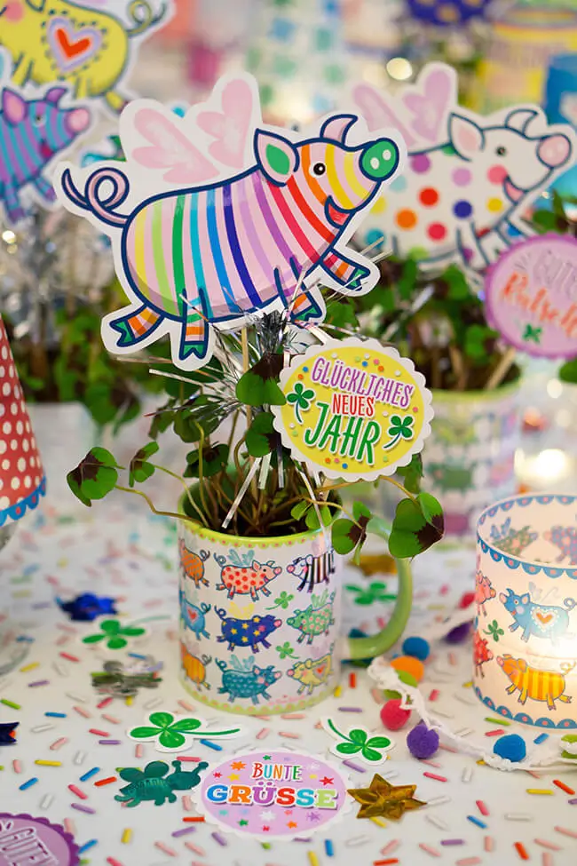 Für Blumenstecker etc. habe ich etwas stabileres 130g Papier benutzt und die bunten Schweinchen mit einem Laserdrucker ausgedruckt!
