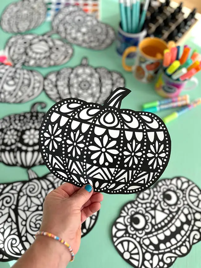 - Auf insgesamt 12 Seiten gibt es auf jeder Seite jeweils einen großen Kürbis wie Scherenschnitt.
