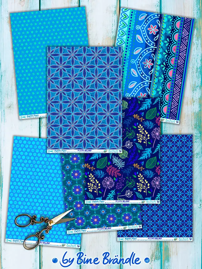Gemusterte Papierbögen Mustermix Blau zum Selbstausdrucken, Basteln und Dekorieren!