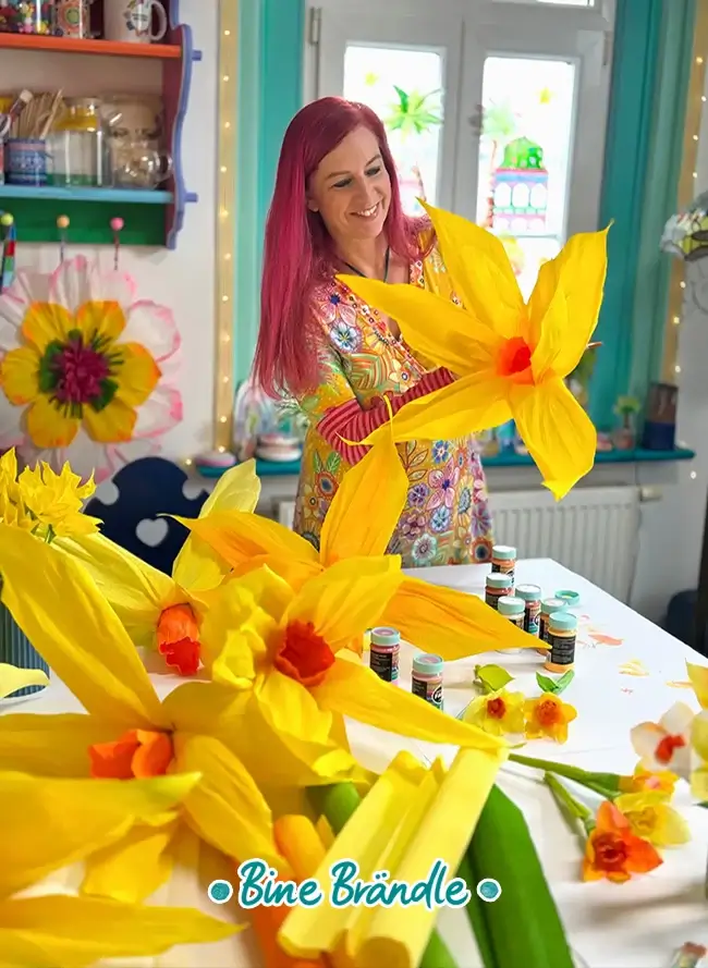 Ausführliche deutsche Anleitung für Narzissen aus Krepppapier.