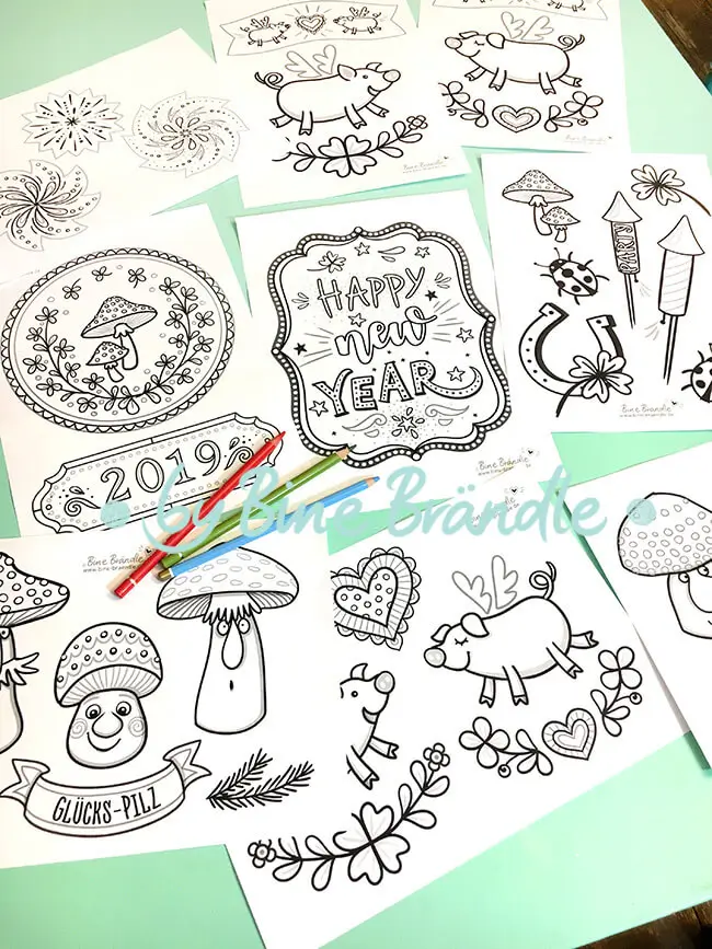 - 1 Seite mit Hufeisen, Raketen, Pilzen, Marienkäfern